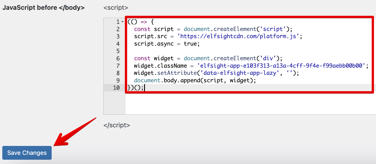 (() => { const script = document.createElement('script'); script.src = 'https://elfsightcdn.com/platform.js'; script.async = true; const widget = document.createElement('div'); widget.className = 'elfsight-app-WIDGET_ID'; widget.setAttribute('data-elfsight-app-lazy', ''); const footer = document.querySelector('footer'); if (footer) { footer.before(widget); document.head.appendChild(script); } else { document.body.append(script, widget); } })();
