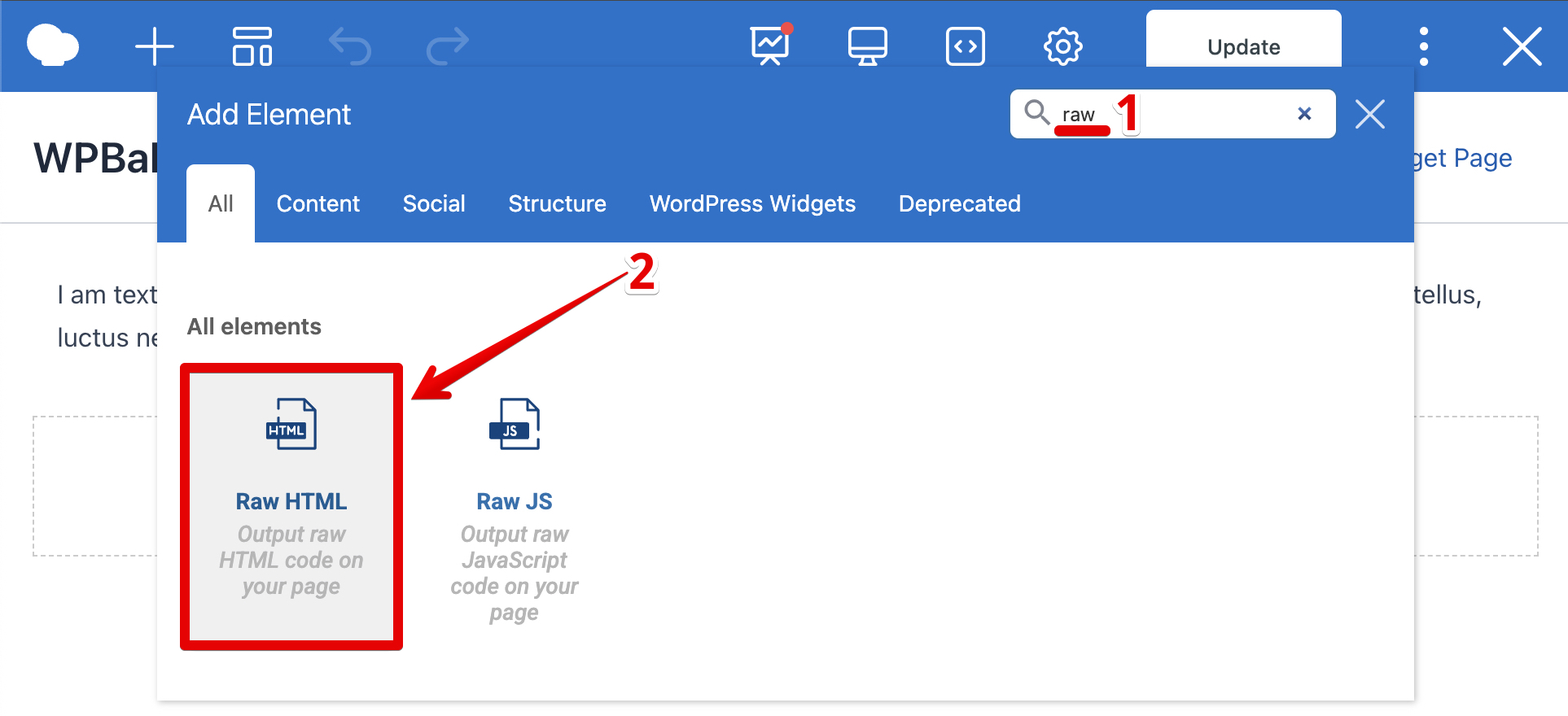 Locate the spot on the page where you want to place the widget and click the ➕ icon:Use the search in the upper-right corner to find the Raw HTML element: