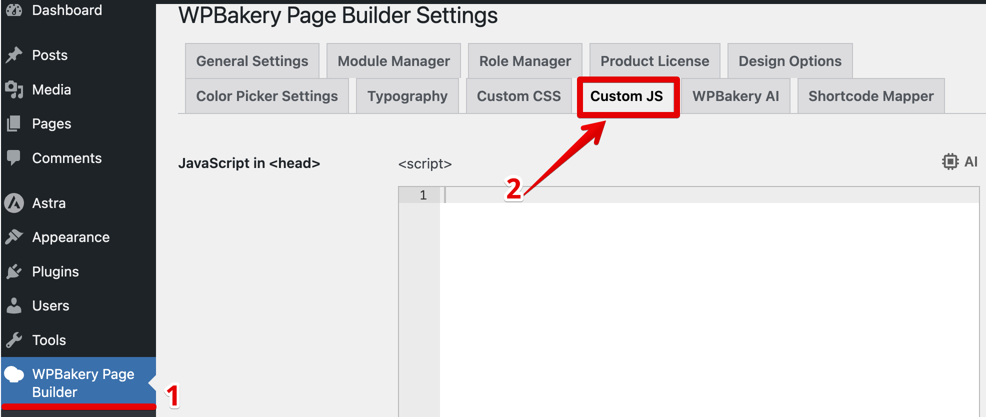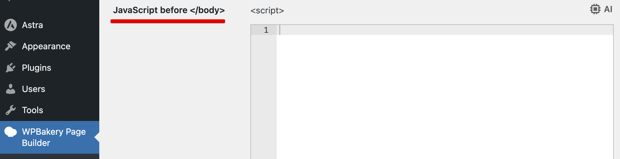 Log in to WordPress, navigate to WPBakery Page Builder left-hand menu, and click Custom JS:Scroll down to JavaScript before </body> section: