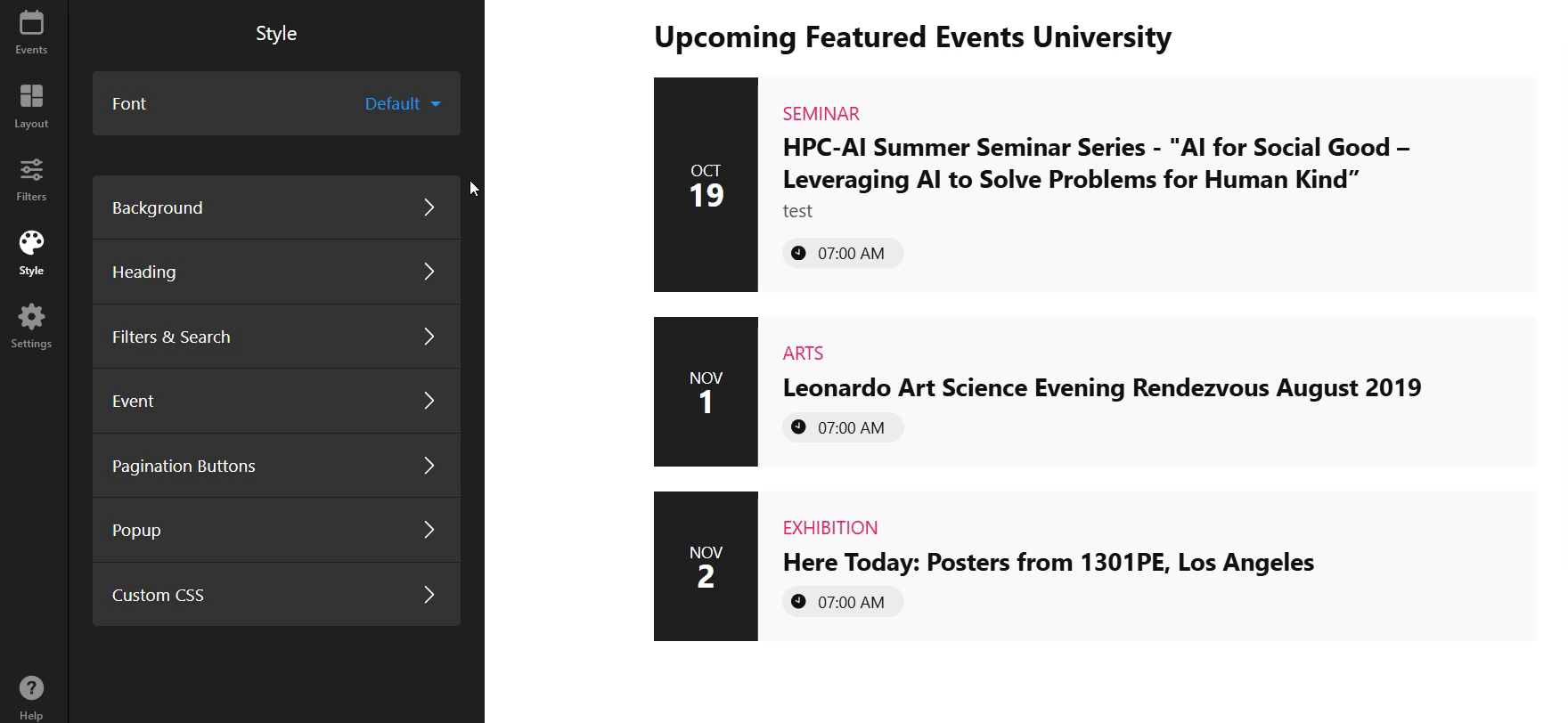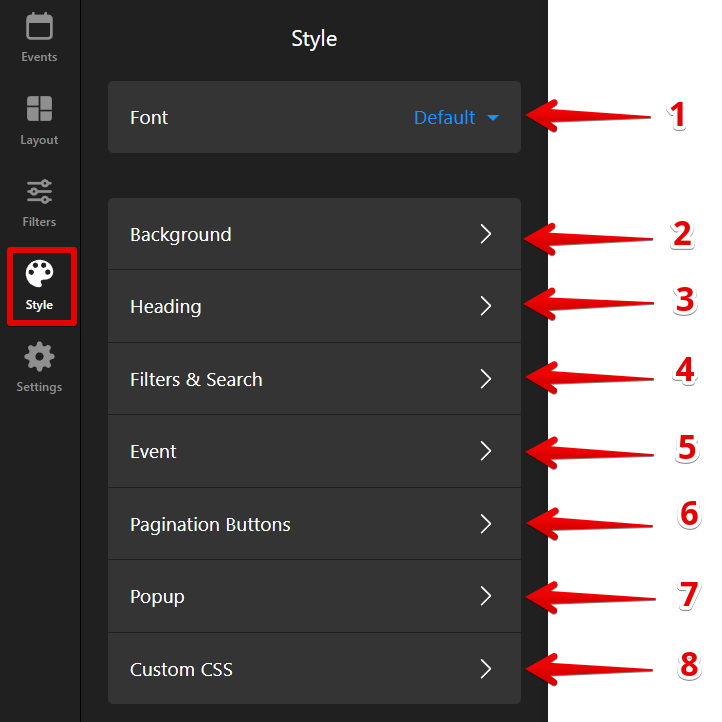 In the Style tab, you can change your calendar’s overall appearance to match your website’s design. You can customize fonts, background colors, event text, headings, and other elements: