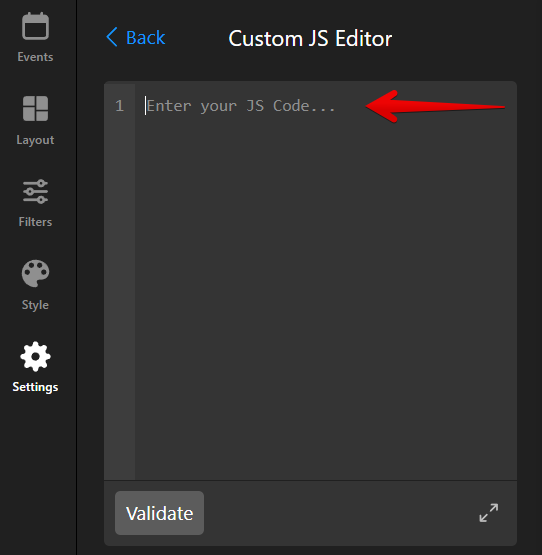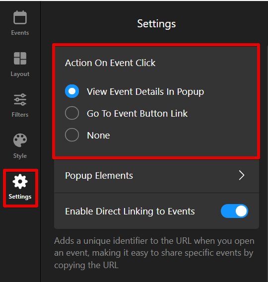 In the Settings tab, you'll find the Action On Event Click feature, which allows you to control how users interact with events on your calendar: