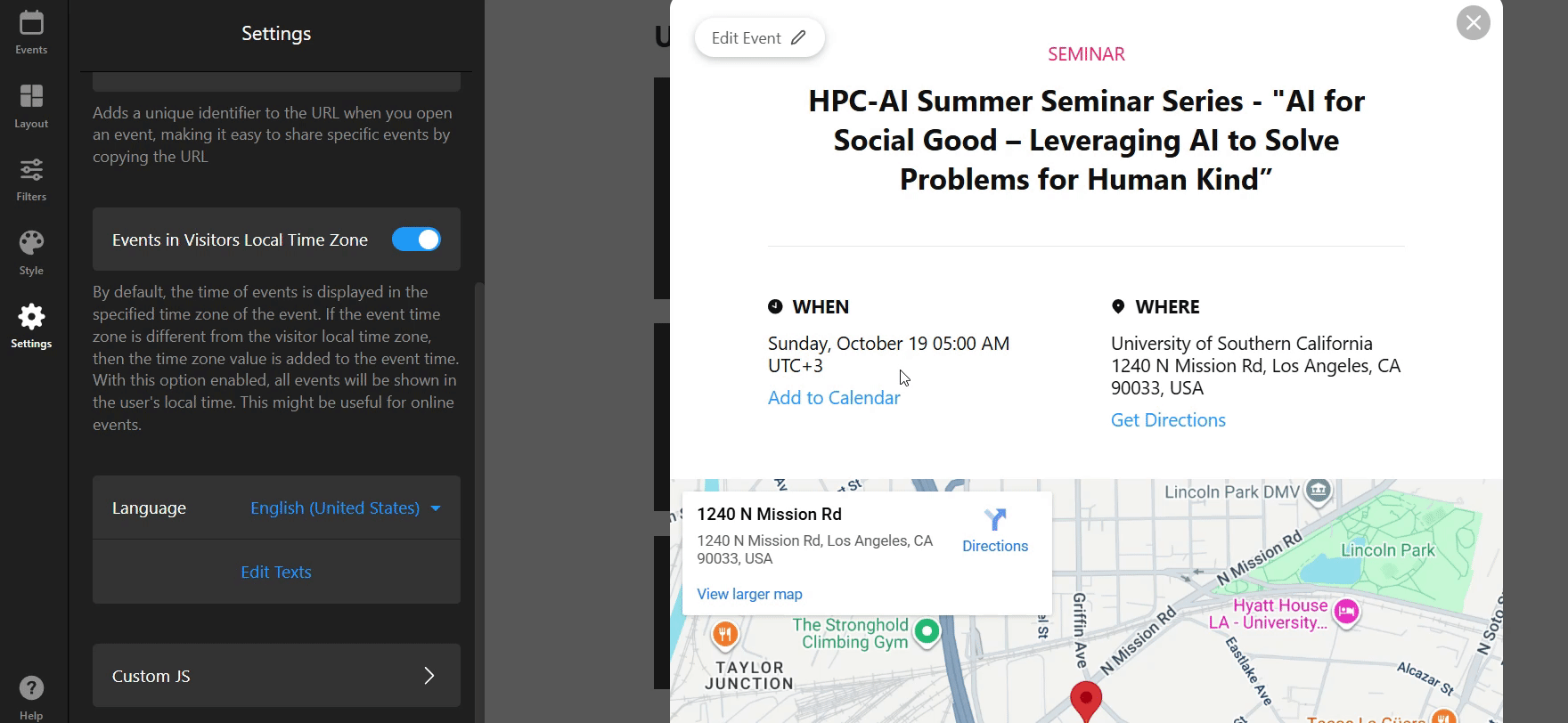 Customize the calendar for your site by adjusting language, time zone, and other advanced settings. These tweaks ensure the calendar fits seamlessly with your website's design and enhances user experience.