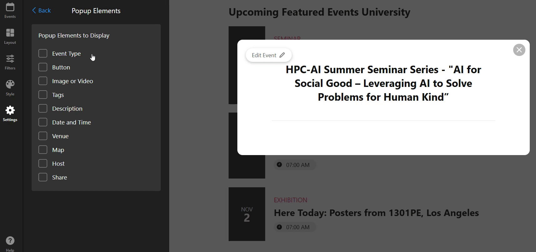 By selecting this option, you can also adjust which elements appear in the popup via the Popup Elements setting, such as event description, date, time, location, and more: