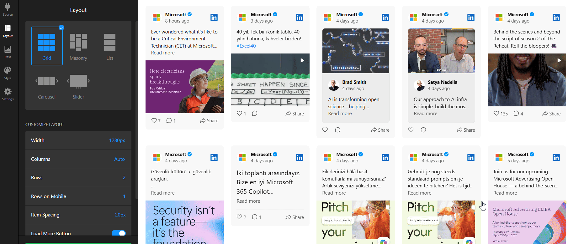 When setting up your LinkedIn Feed, you can choose from five layout options — Grid, Masonry, List, Carousel, and Slider: