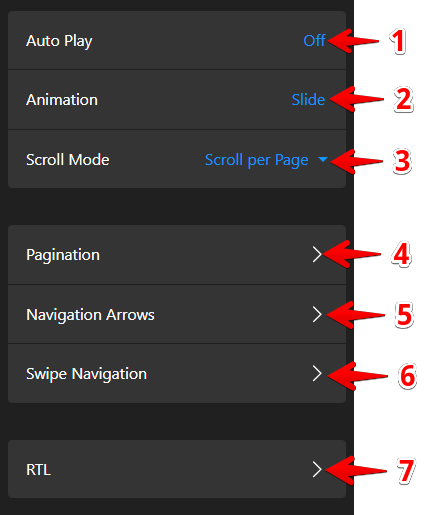 For Slider and Carousel layouts, you can also adjust the navigation, pagination, auto-play, and other settings: