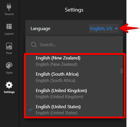 Use the Language section in the Settings tab to set your widget’s language. Simply choose your preferred option from the dropdown: