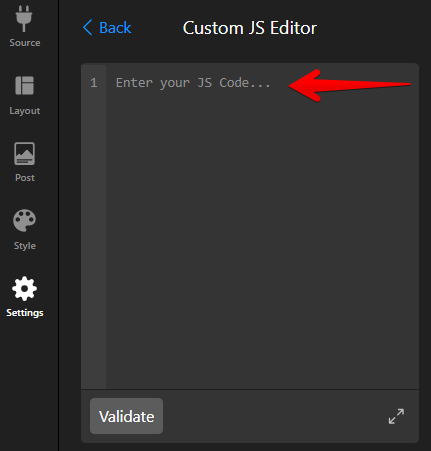 For advanced customization, you can add custom JavaScript. This allows you to integrate with external tools, track actions like share button clicks, or apply more complex behaviors to your widget: