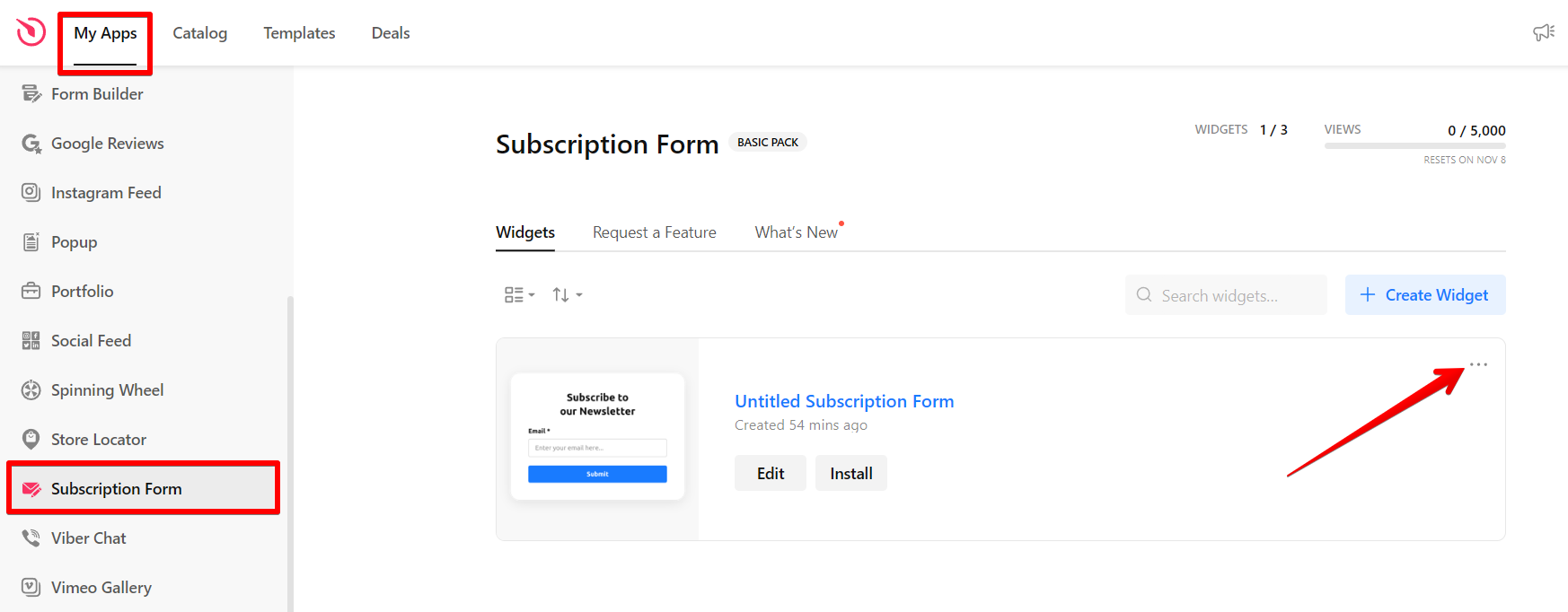 Go to the My Apps page in your dashboard, select Subscription Form, and click the action button (...):