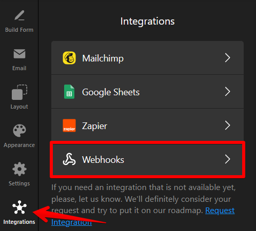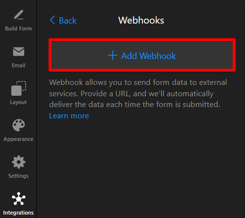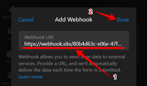 Enter the webhook URL where you want to receive submissions and click Done:   You can learn more about Webhooks integration and how to set it up in this guide: Using Webhooks in Your Form Widget.