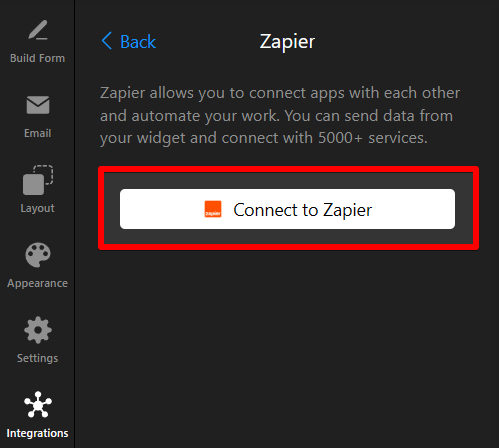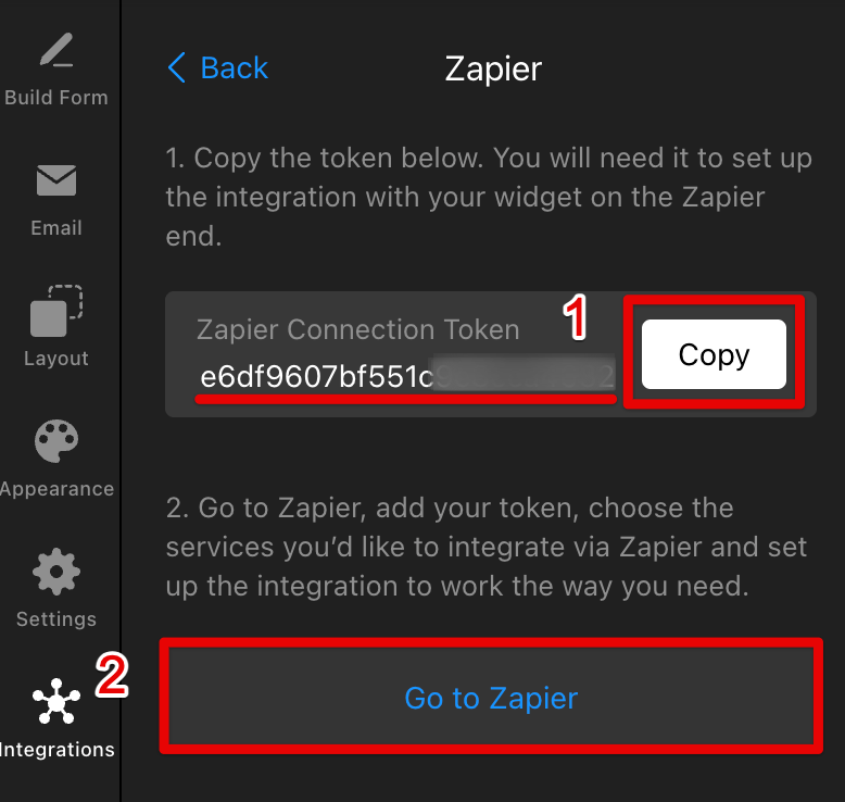 Copy the token from the Zapier Connection Token field (you will need to enter it on the Zapier side when setting up the integration). Next, click on the Go to Zapier button:  For more detailed instructions on how to connect your widget to Zapier, follow the steps in this article: How to integrate your Form widget with Zapier.