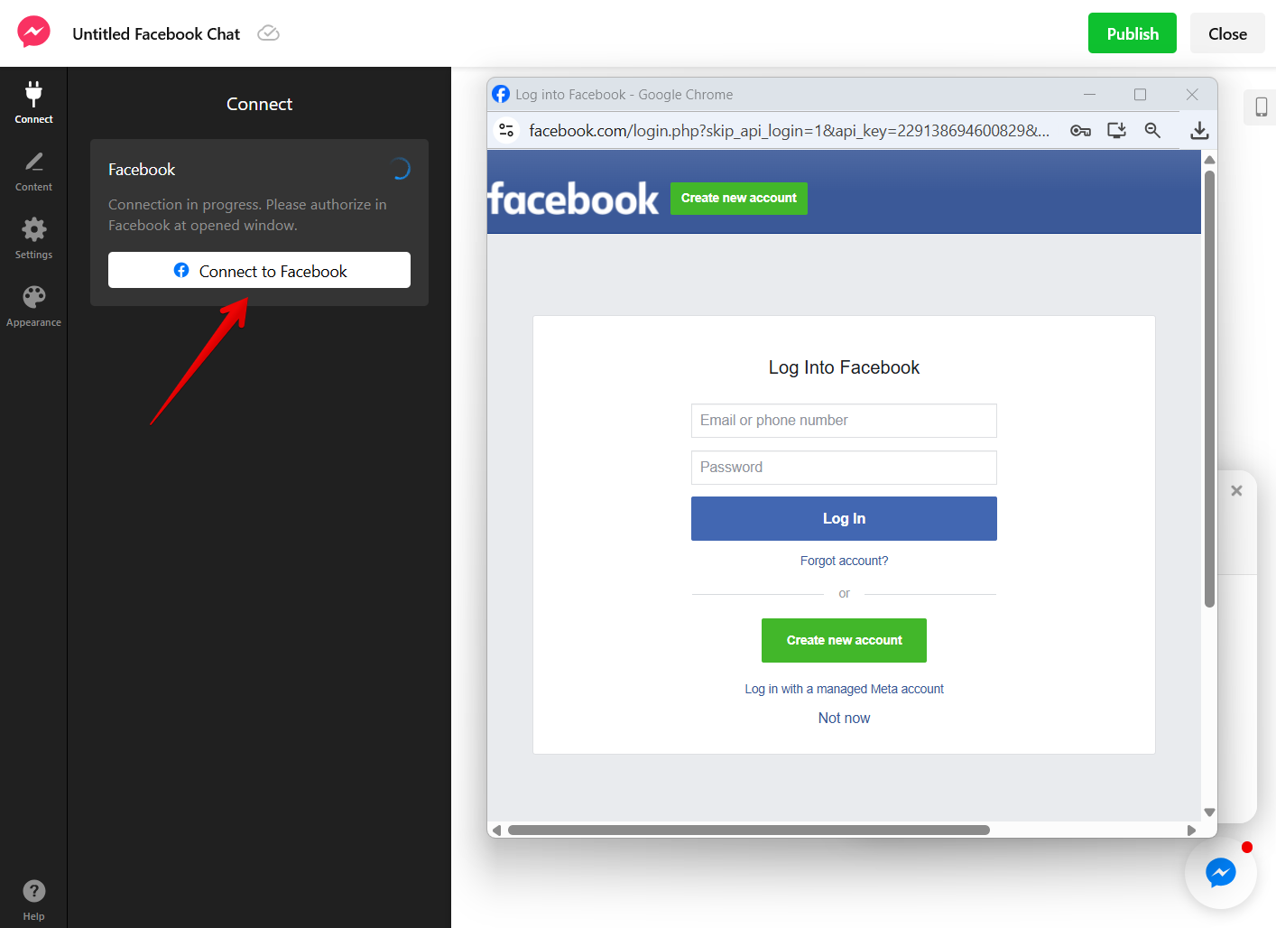 Open the widget's settings, click Connect to Facebook, and proceed with authorization: