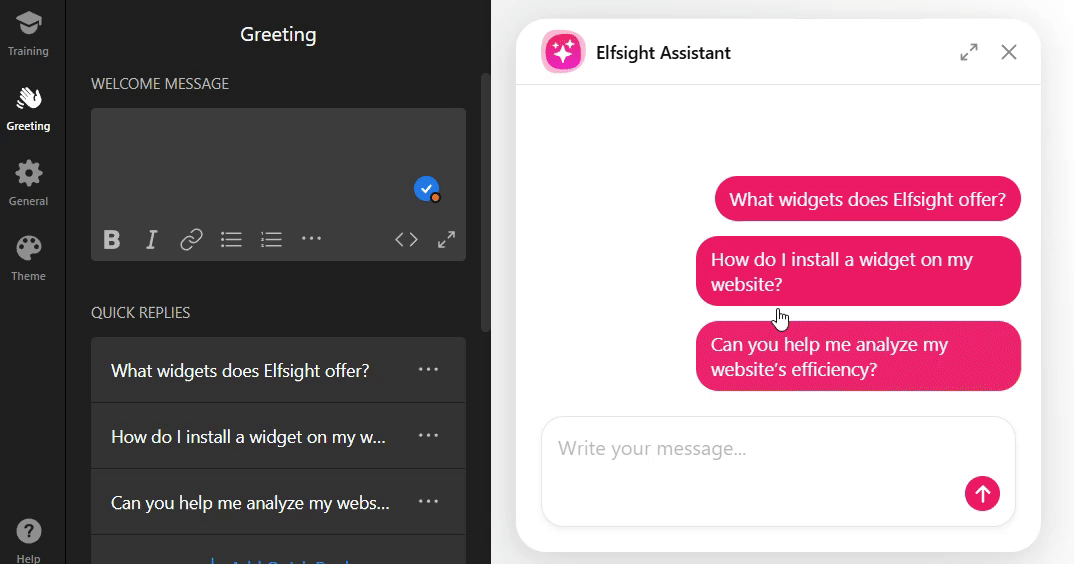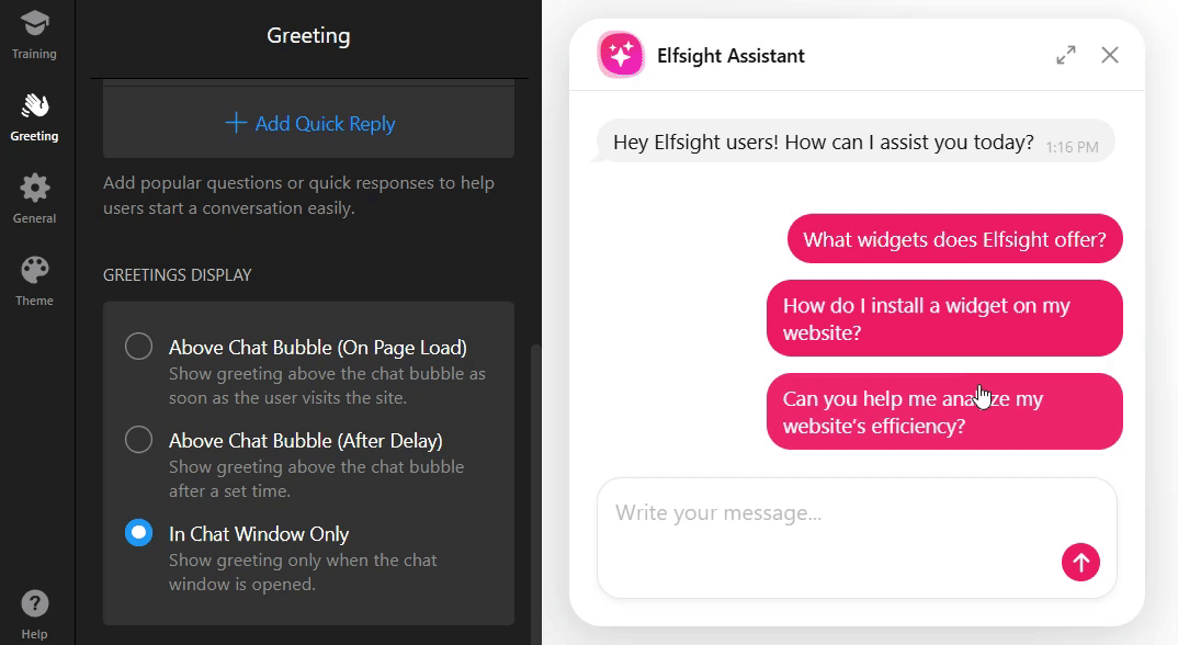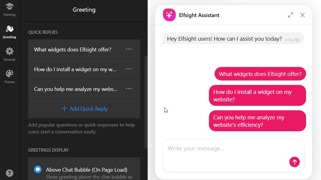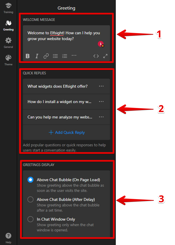 Set up quick replies and control how the greeting appears for a smoother user experience. Here’s what you can adjust: