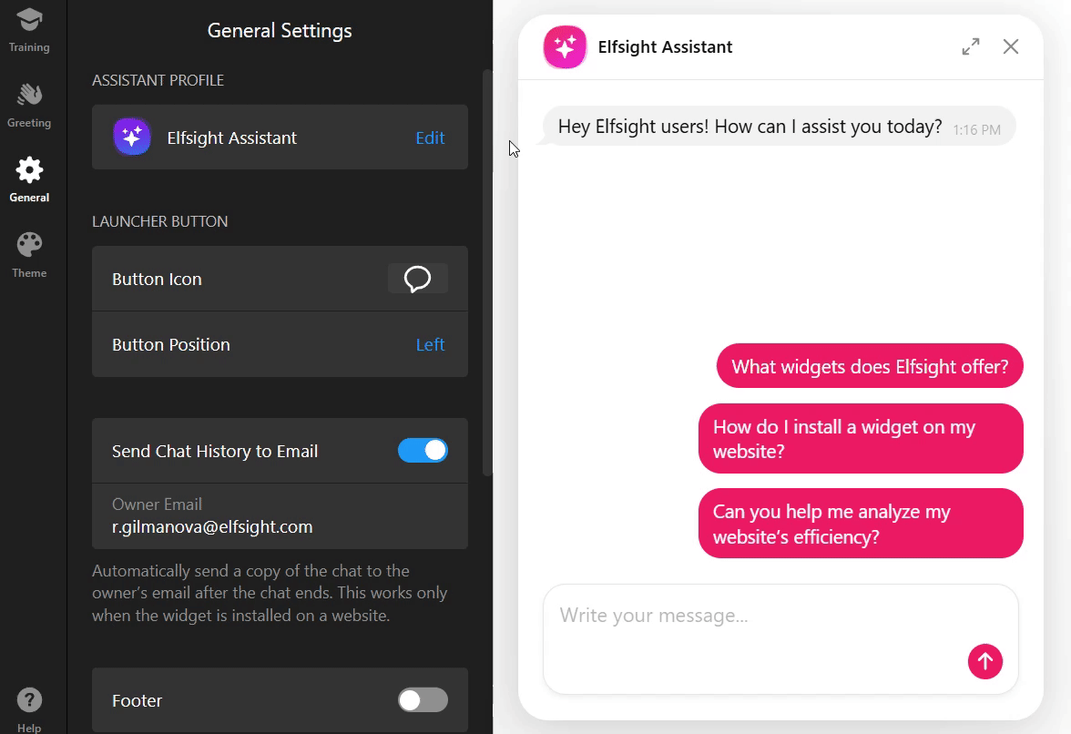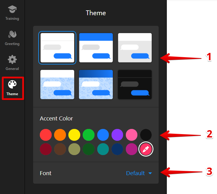 Now, let’s personalize the colors and overall design of your chatbot. In the Theme tab, you can choose from various pre-made themes and color schemes that match your website’s branding. Key customization options include: