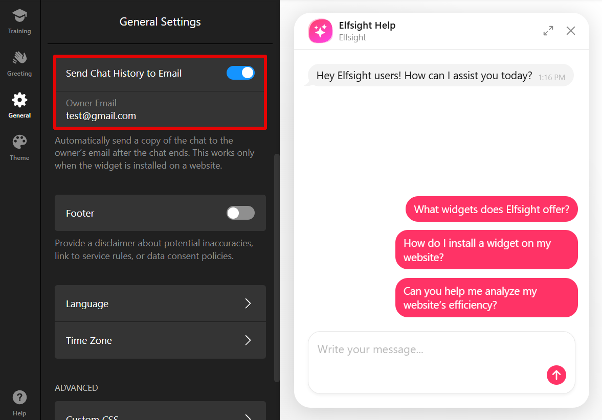 Enable this option to automatically send chat histories to the specified email address after each conversation: