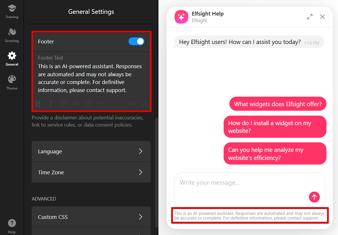 Enable the Footer toggle to add a disclaimer about potential inaccuracies or to link to your data consent policies, ensuring legal compliance:
