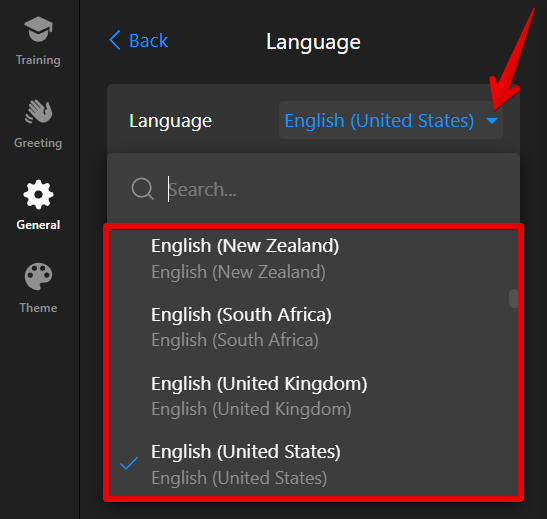In the Language section, you can change the text or language in your chat. Simply select your preferred language from the dropdown: