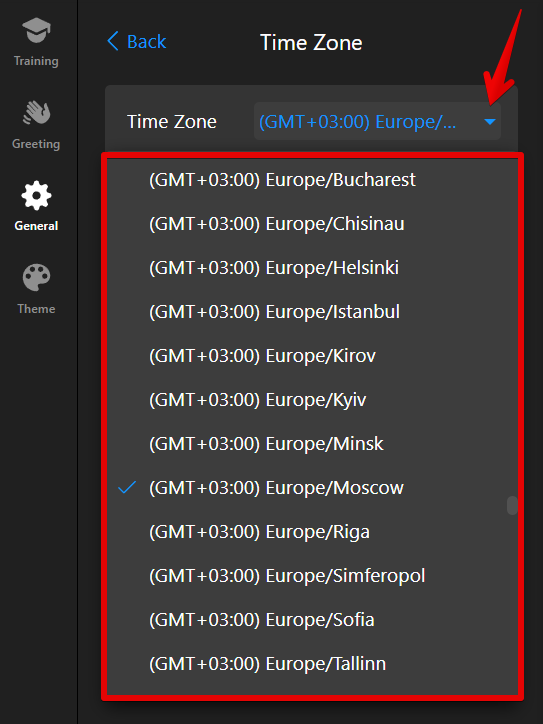 In the Time Zone section, you can select the correct time zone to ensure users see the accurate time in the email transcript: