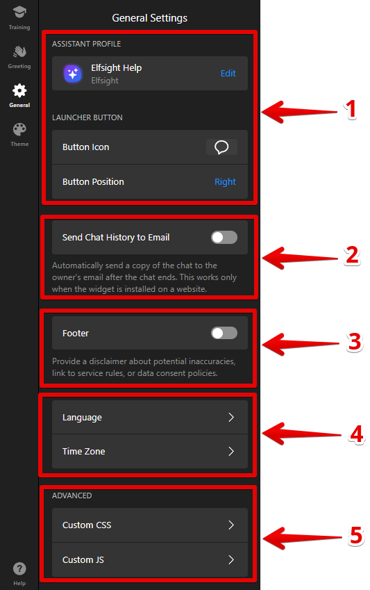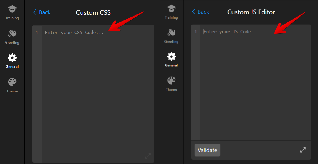 For even more customization, you can add custom JavaScript and CSS codes. These options allow you to integrate your widget with external tools, track events, and tweak the appearance and behavior of your widget: