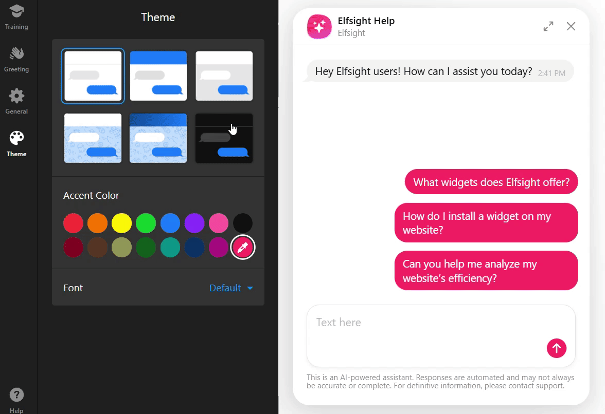 - Accent Color — Choose a color that complements your brand. This color will be used in the chatbot's interface for buttons, text, and other elements.