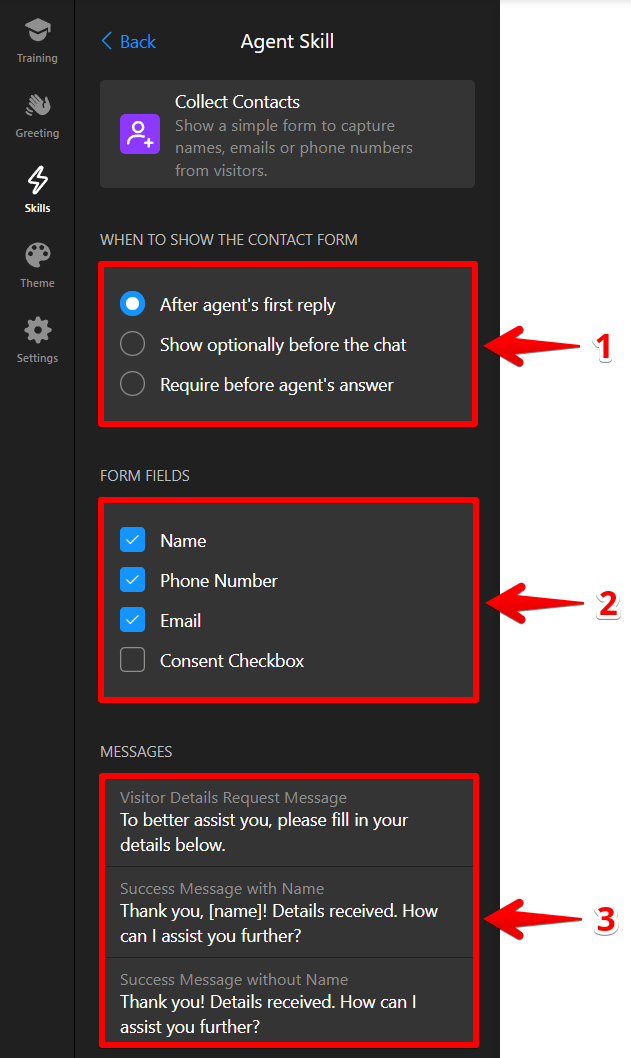 - Form Display Options — Decide when the contact form should appear during the conversation.