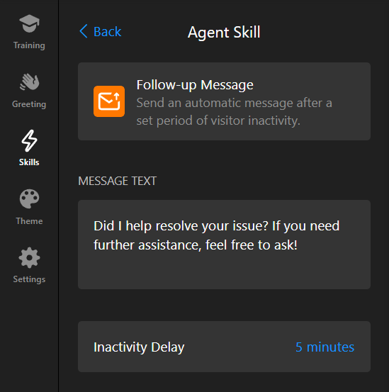 Set automatic follow-up messages to appear after a period of inactivity — perfect for sharing offers, contact details, or thank-you notes: