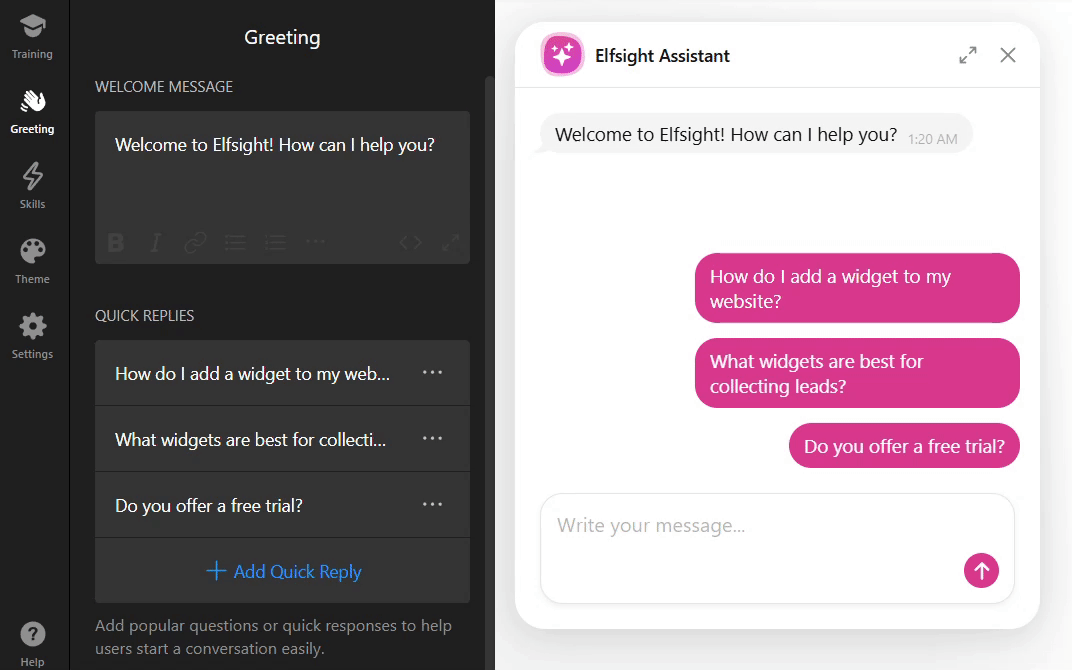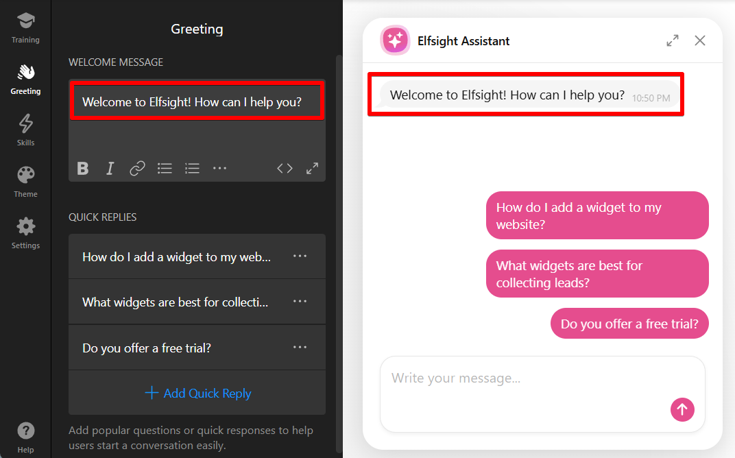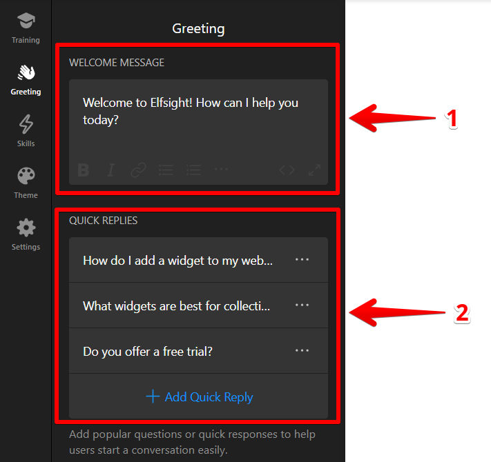 In the Greeting tab, you can customize the first impression your chatbot makes on visitors. Add quick replies and personalize the welcome message to help users get started. Here’s what you can adjust: