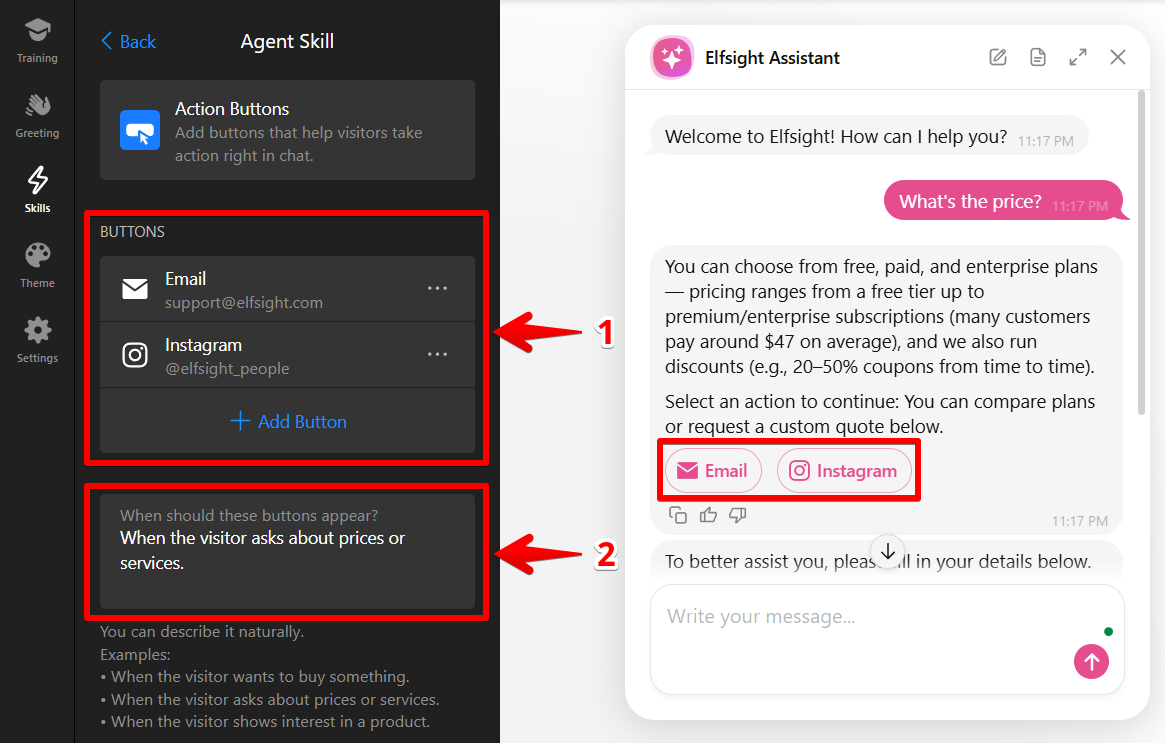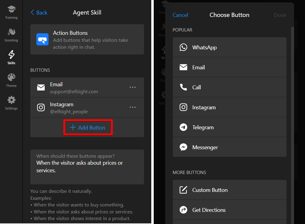 - Contact Buttons — Add buttons to the AI Agent's messages that will redirect the visitor to a real person.