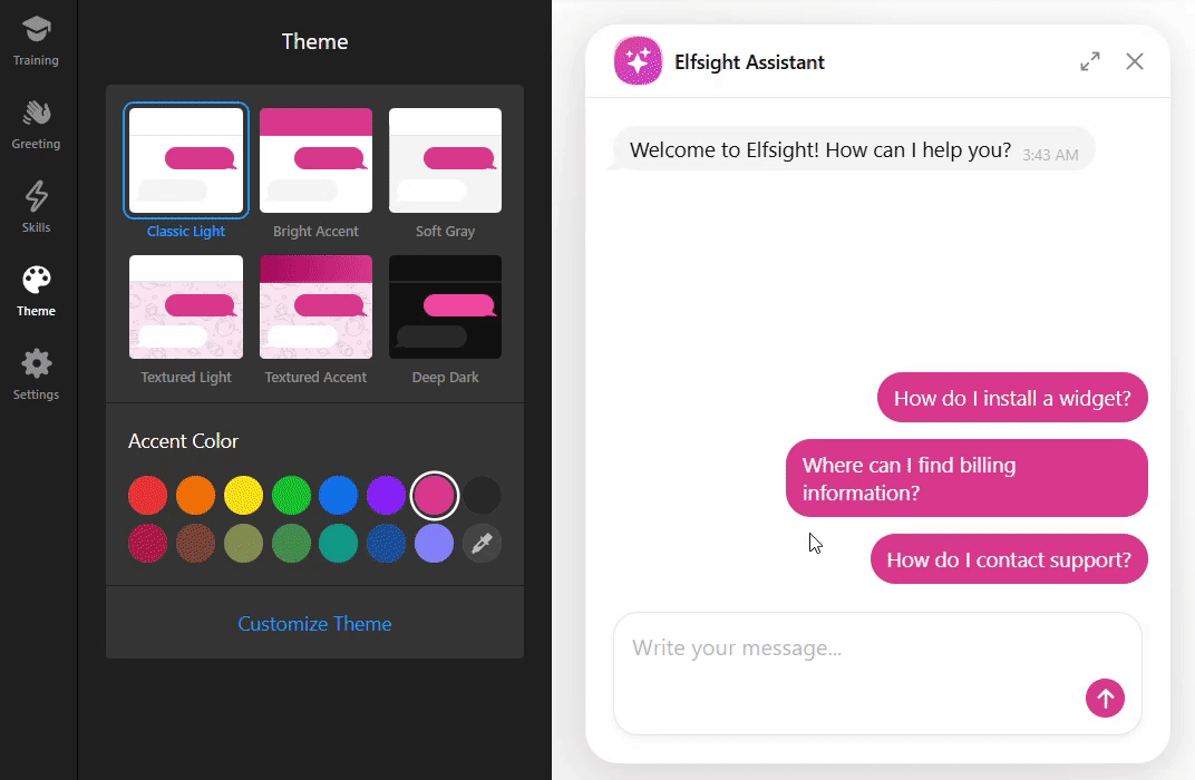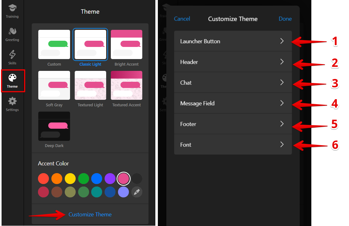 Now, let’s personalize the colors and overall design of your chatbot. In the Theme tab, you can select a preset theme and adjust accent colors to match your website's look.