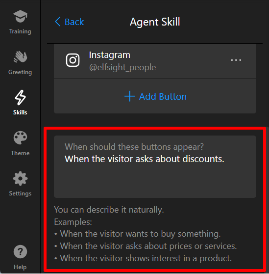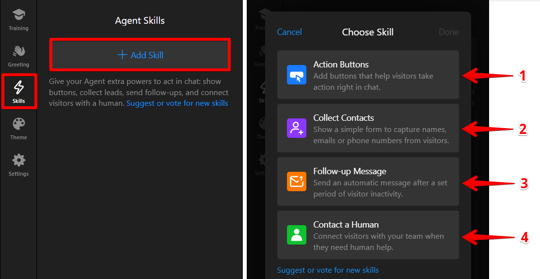 In the Skills tab, you can control how the chatbot interacts with visitors. Click ➕Add Skill and select the option you need: