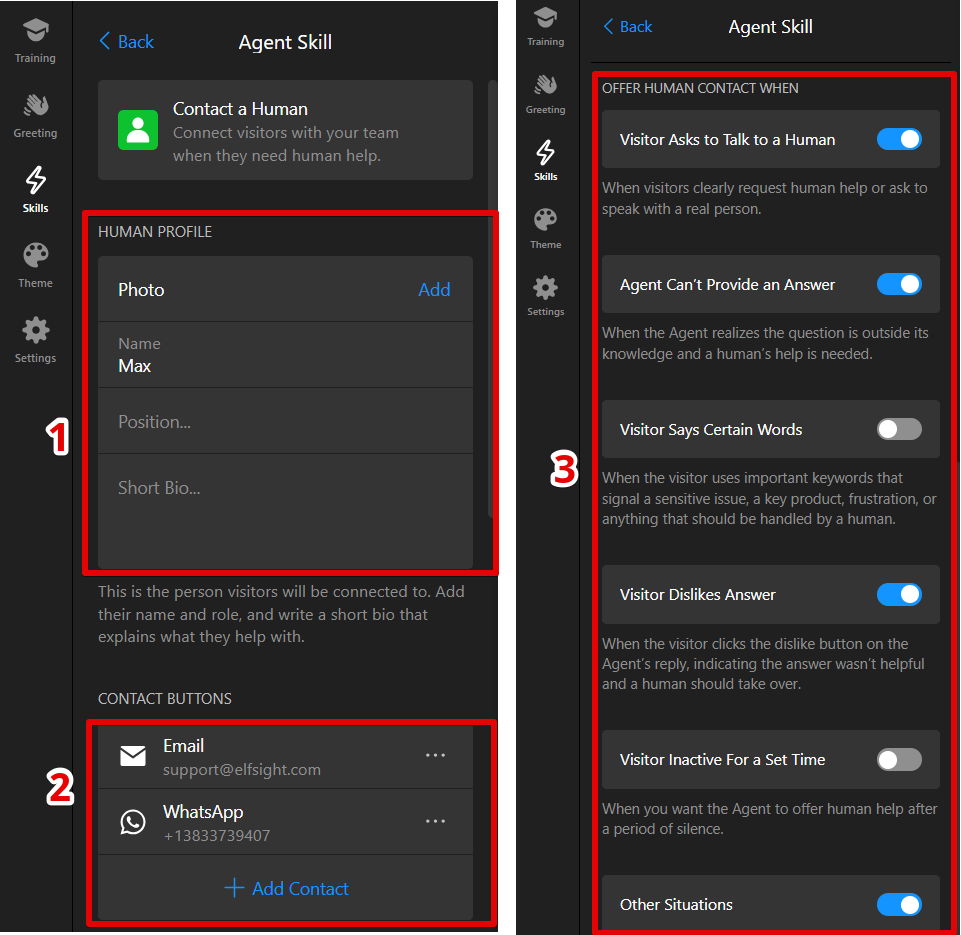 - Options for Contacting a Human — Choose when the chatbot should offer a transfer to a real person. You can use the built-in options or describe your own scenarios in Other Situations.
