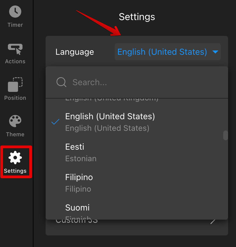 This section allows you to change your widget’s language or customize its text. Open the Language dropdown and select your preferred language: