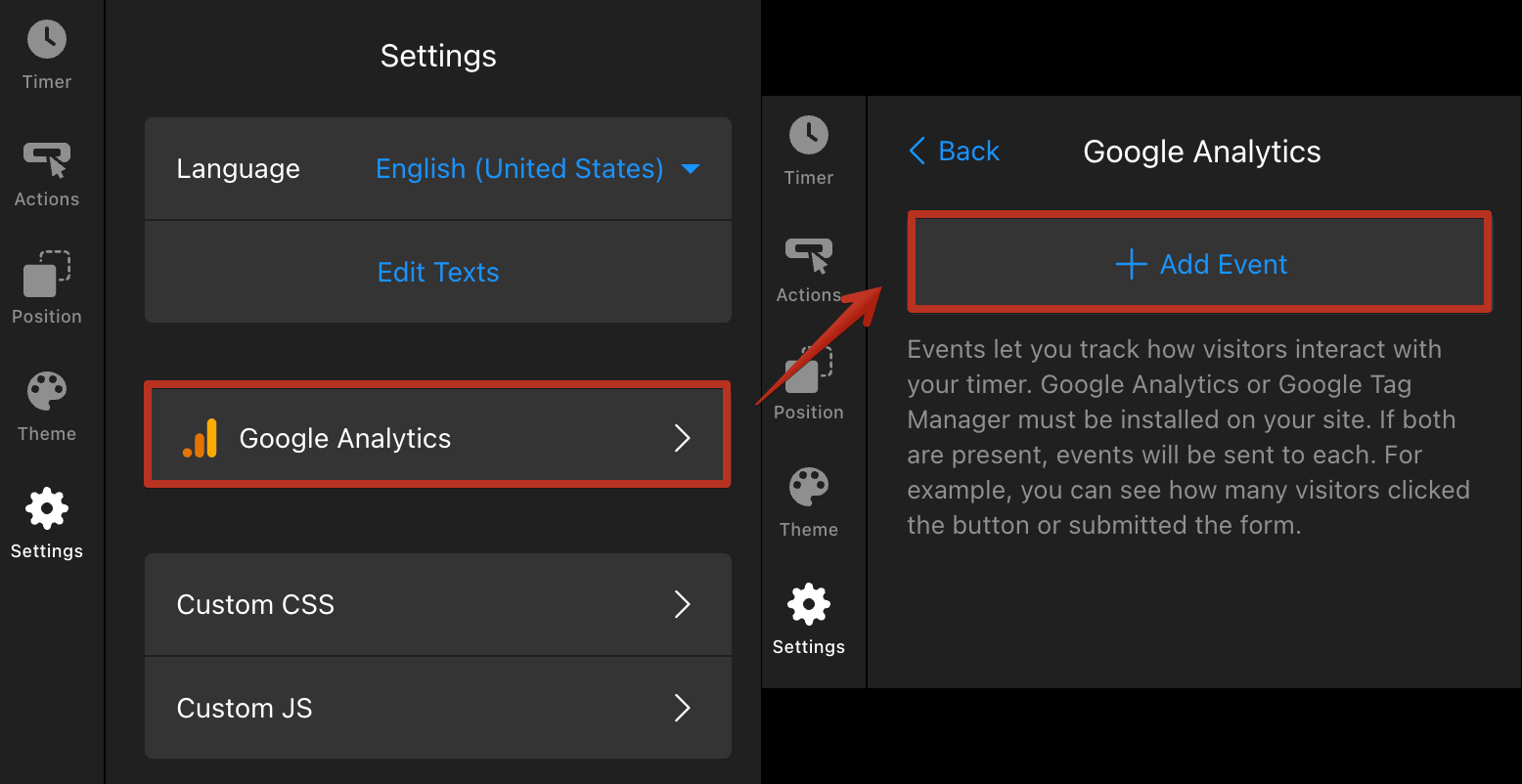 In the Google Analytics section, you can connect your widget to Google Analytics or Google Tag Manager to track user interactions. Click ➕Add Event and choose the actions you want to track: