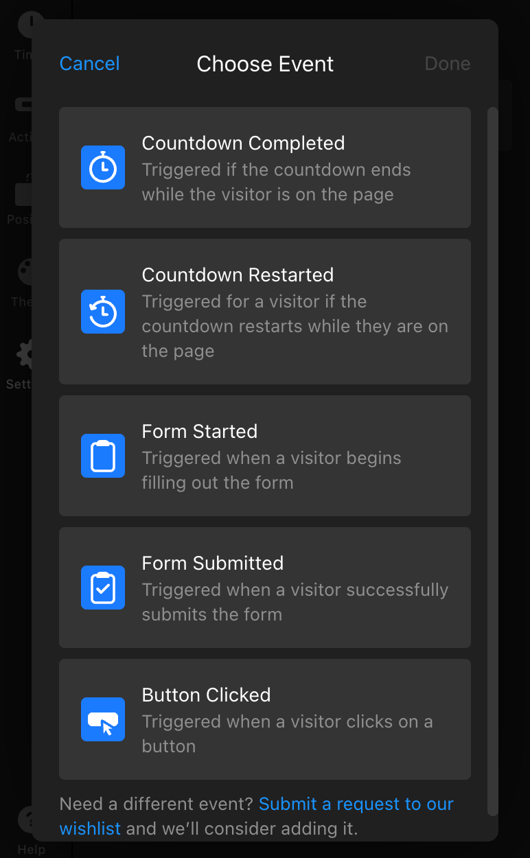 - Countdown Completed — fires when the timer reaches zero while a visitor is on the page.