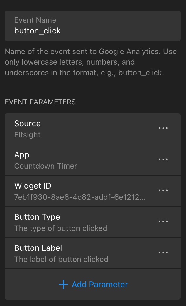 When creating an event, some parameters like Source, App, and Widget ID are filled automatically. If you choose the Button Clicked event, Button Type and Label will also appear. You can remove unnecessary parameters or add custom ones to track specific data: