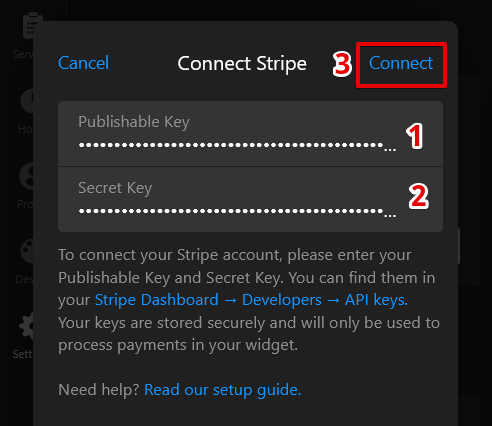 Return to the widget editor, paste both keys into the fields, and click Connect:
