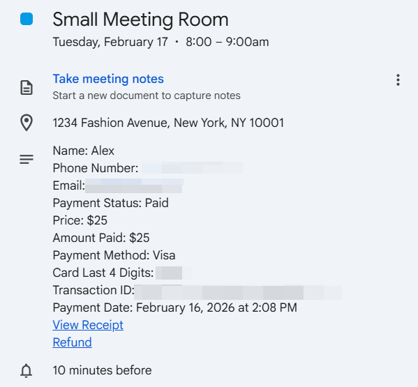 When a booking is synced with Google Calendar, the payment info will appear in the event description like this: