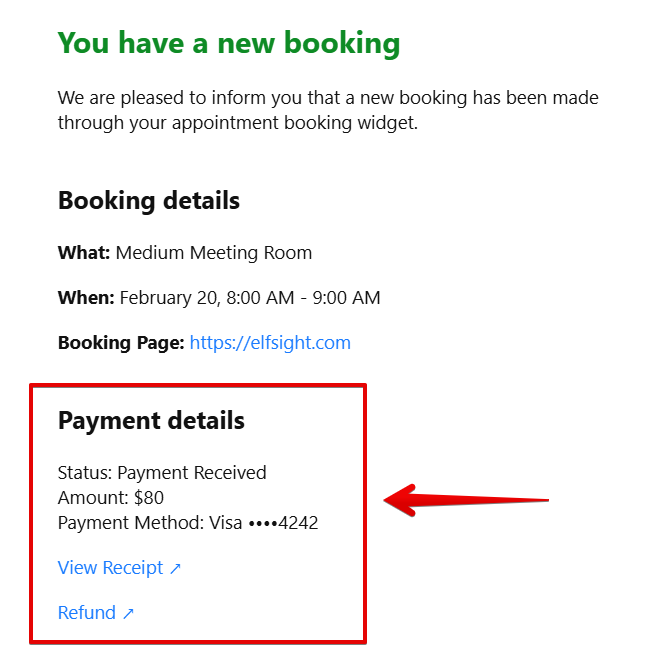 When you receive a new booking email, the payment information will be displayed as shown below: