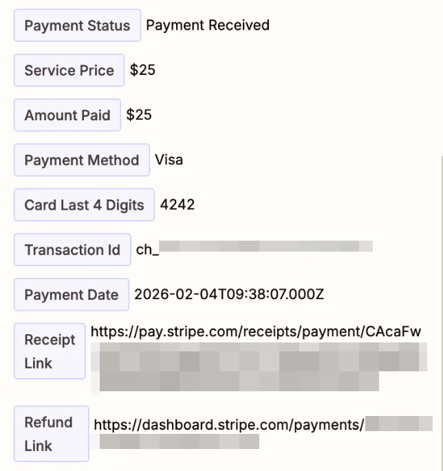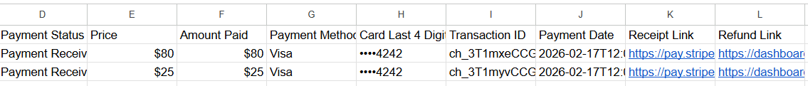 Once payments are enabled, you can access the payment data in your Stripe Dashboard and your booking notifications. The following payment details will be transferred: