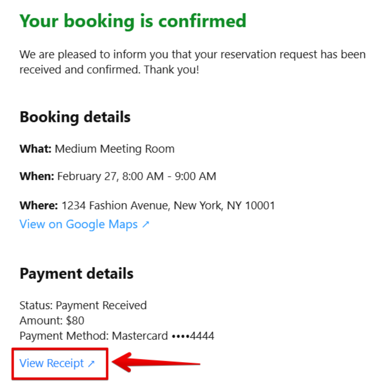 Сustomers can access their receipt on the Confirmation screen and in the email sent after booking: