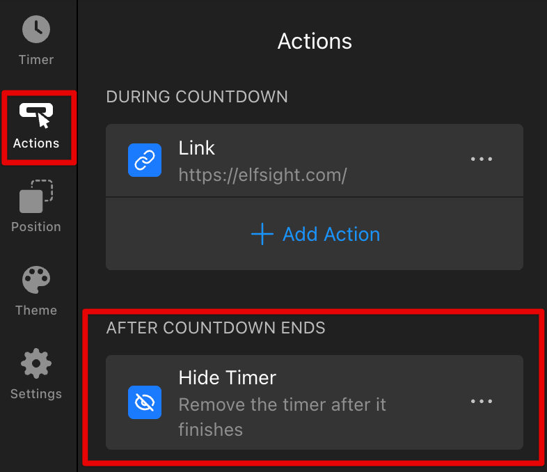 If the countdown has already finished, the widget may be set to hide or redirect instead of remaining visible. You can check which countdown-end action is selected by navigating to the Actions tab → After Countdown Ends: