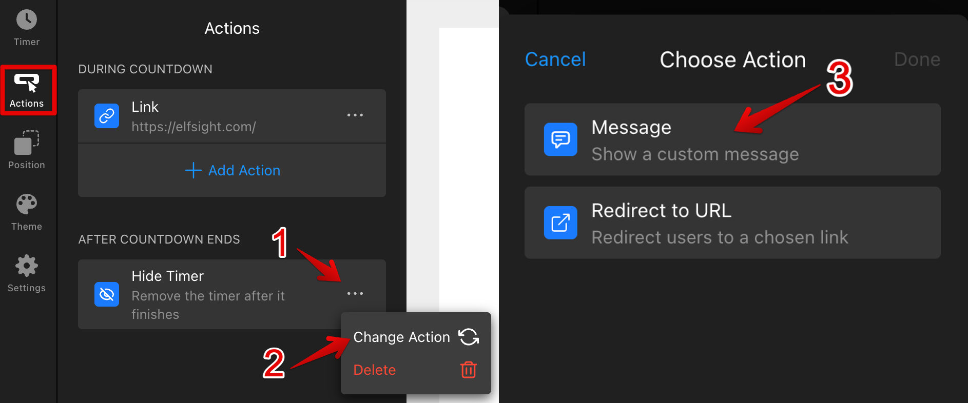 To keep the timer visible after it ends, click the three dots (...) → Change Action and choose Message to set the text you’d like to display: