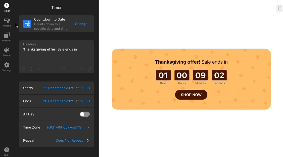 If this option is activated and the start date hasn’t arrived yet, the timer will not appear on your site. Disable it if you want the timer to be visible before the countdown starts.