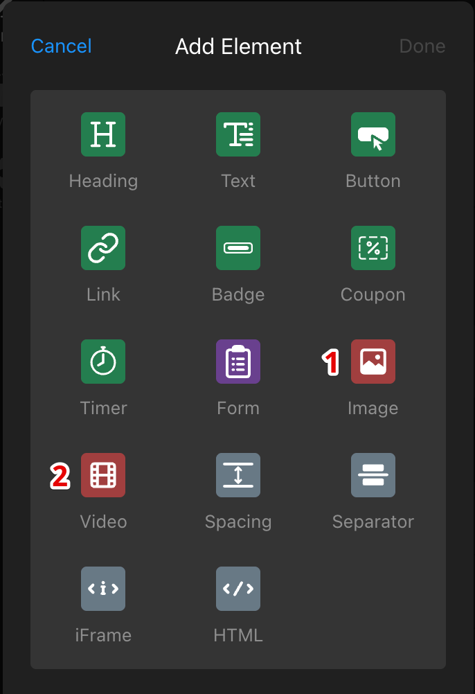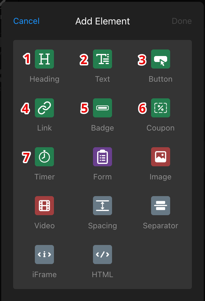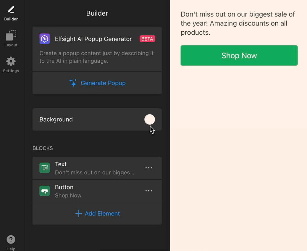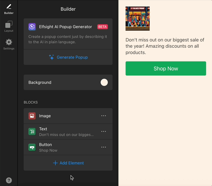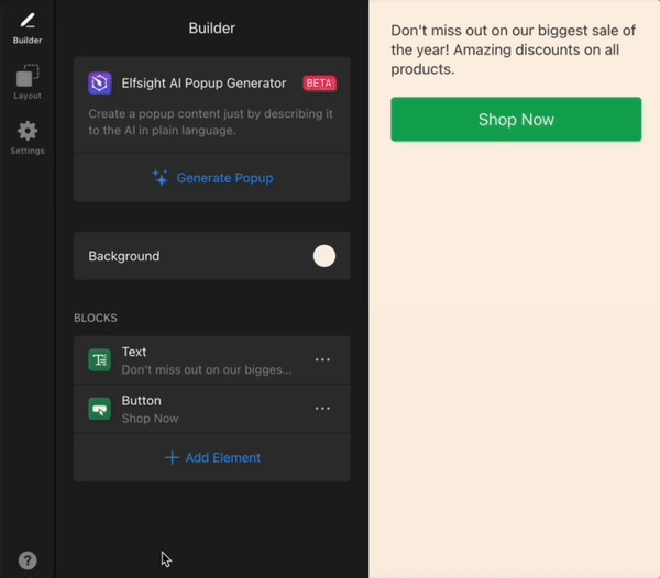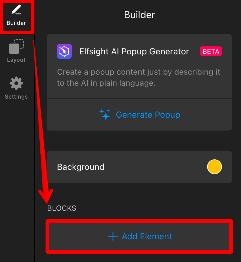 Elements are the building blocks of your popup. You can add them in Builder → Add Element: