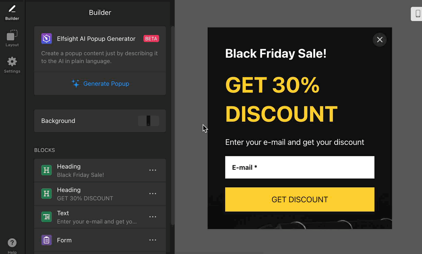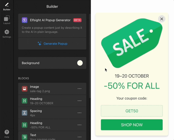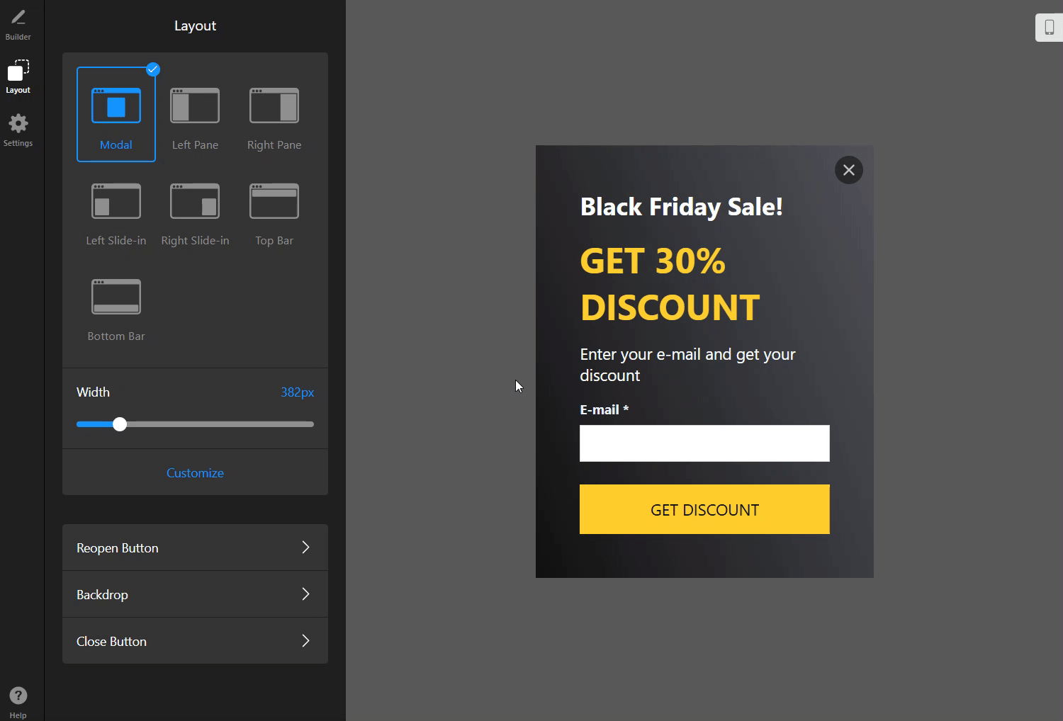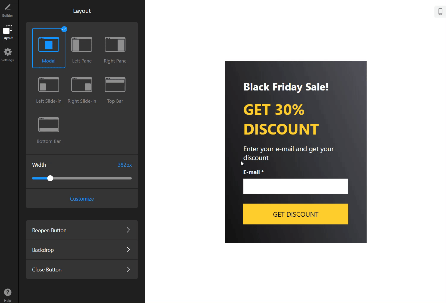Start by creating your popup and setting its overall appearance in the Builder tab.