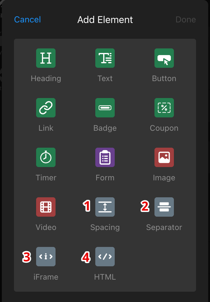 - HTML — Add custom HTML code to embed advanced or custom content.