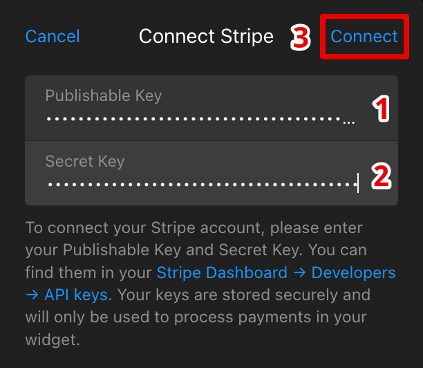 Return to the widget editor, paste both keys into the fields, and click Connect: