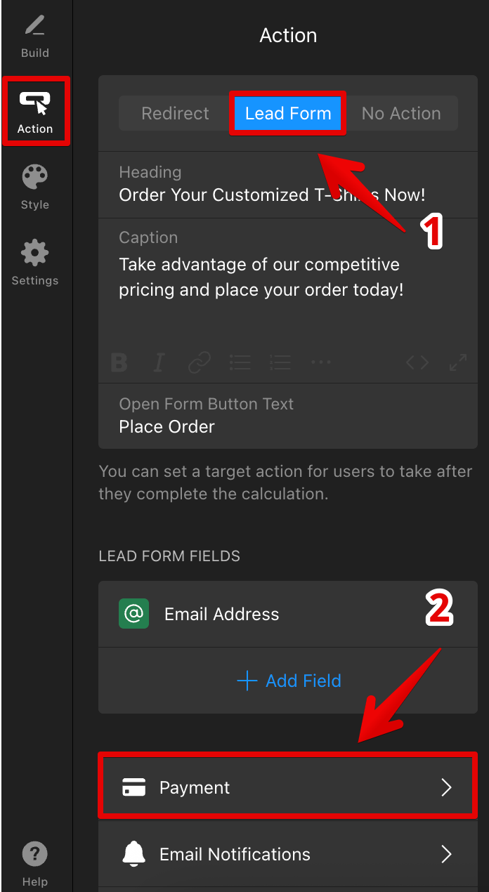 Payments are available only when the Lead Form action is enabled. To learn how to build and customize your form, see How to Collect Submissions Using the Calculator Widget. - 2