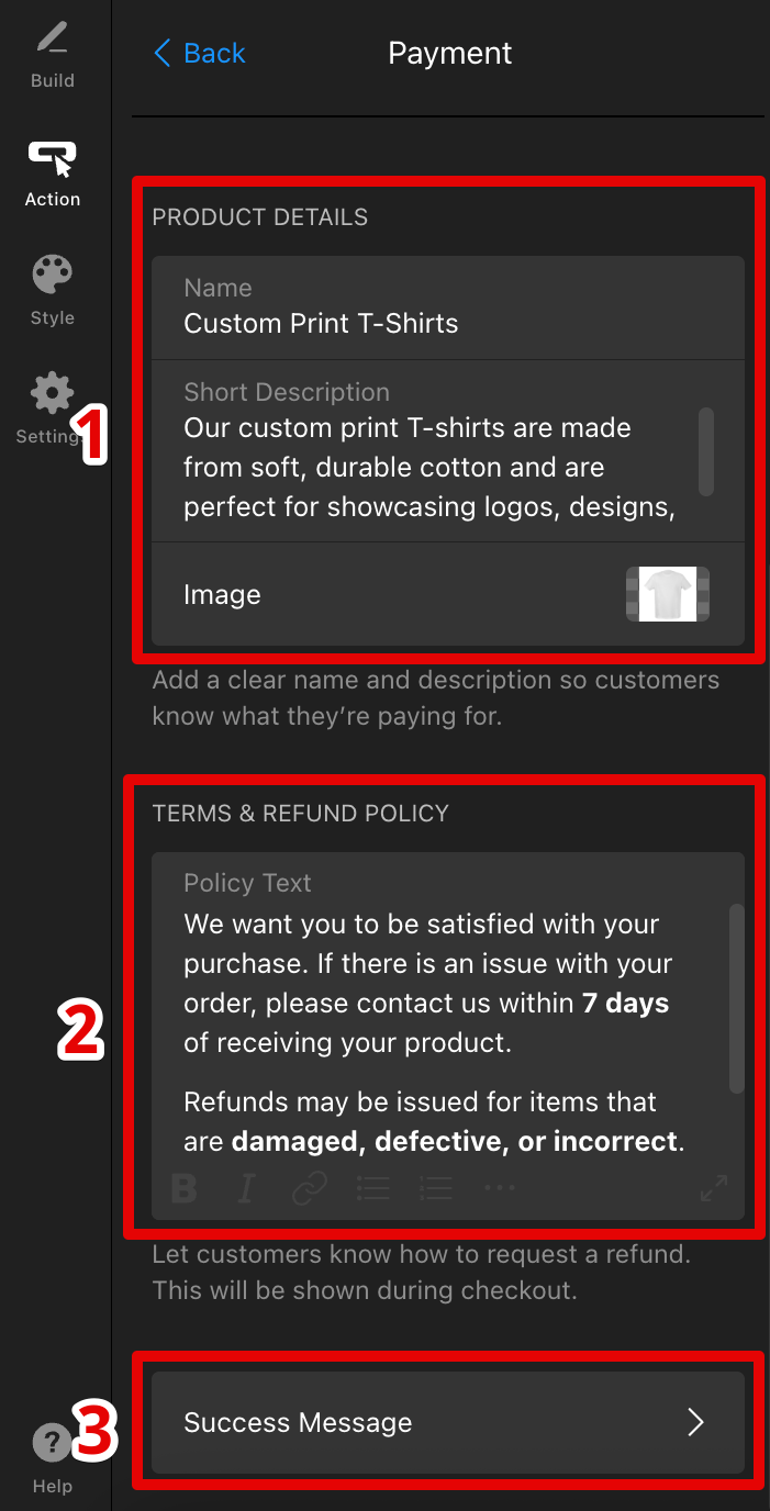 These optional settings help you customize the checkout experience by adding product details, a refund policy, and a confirmation message for your customers: