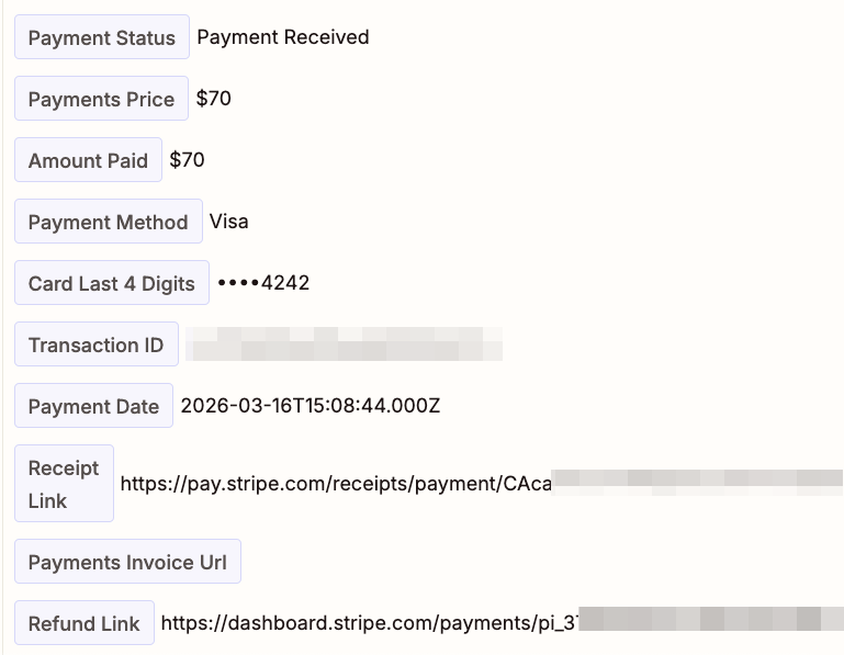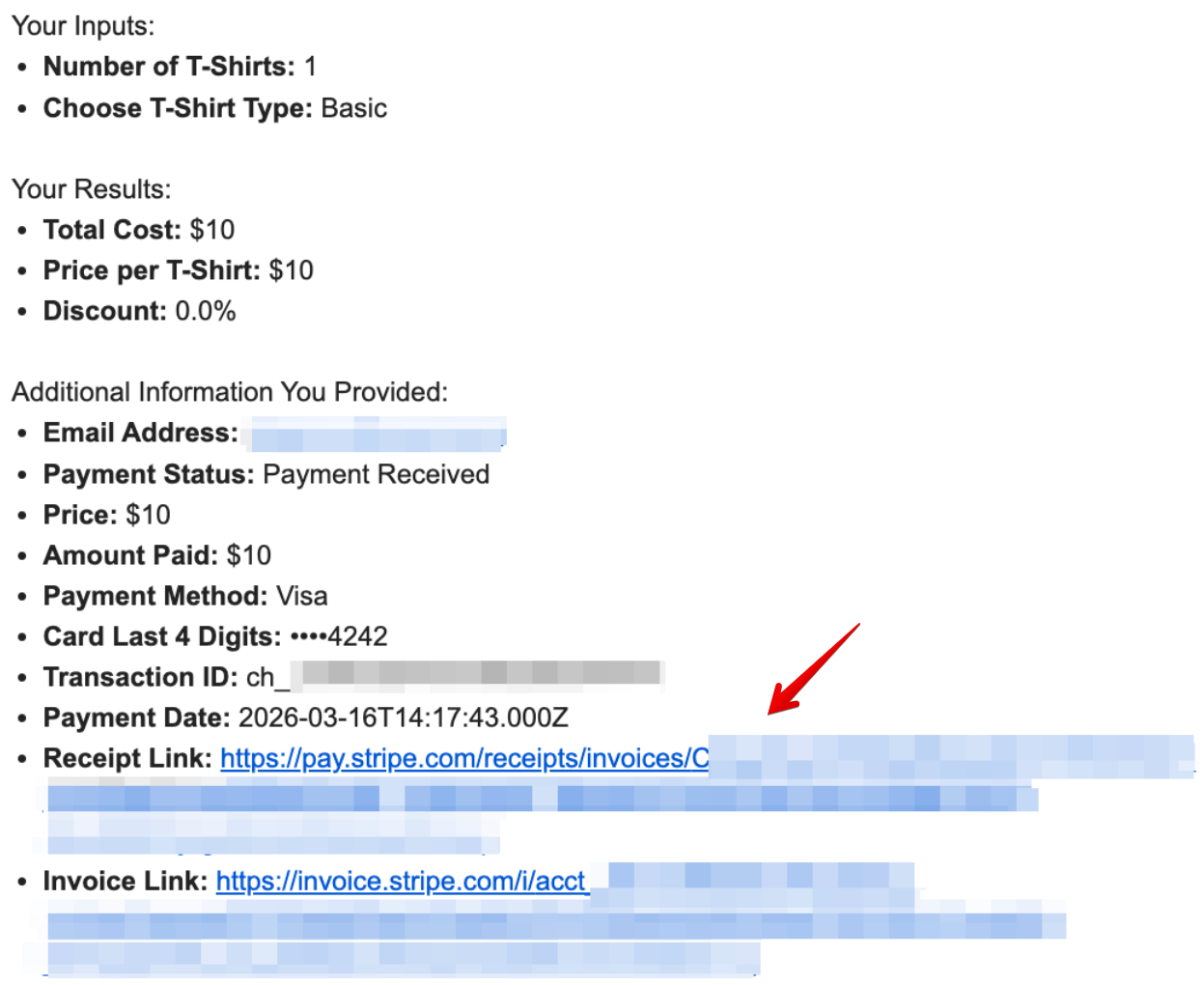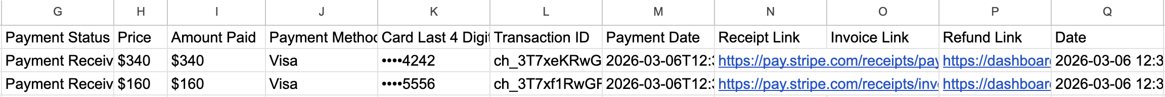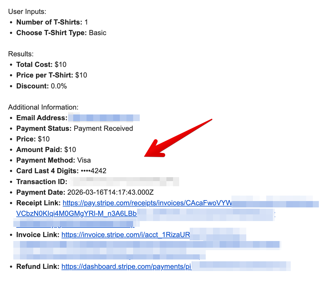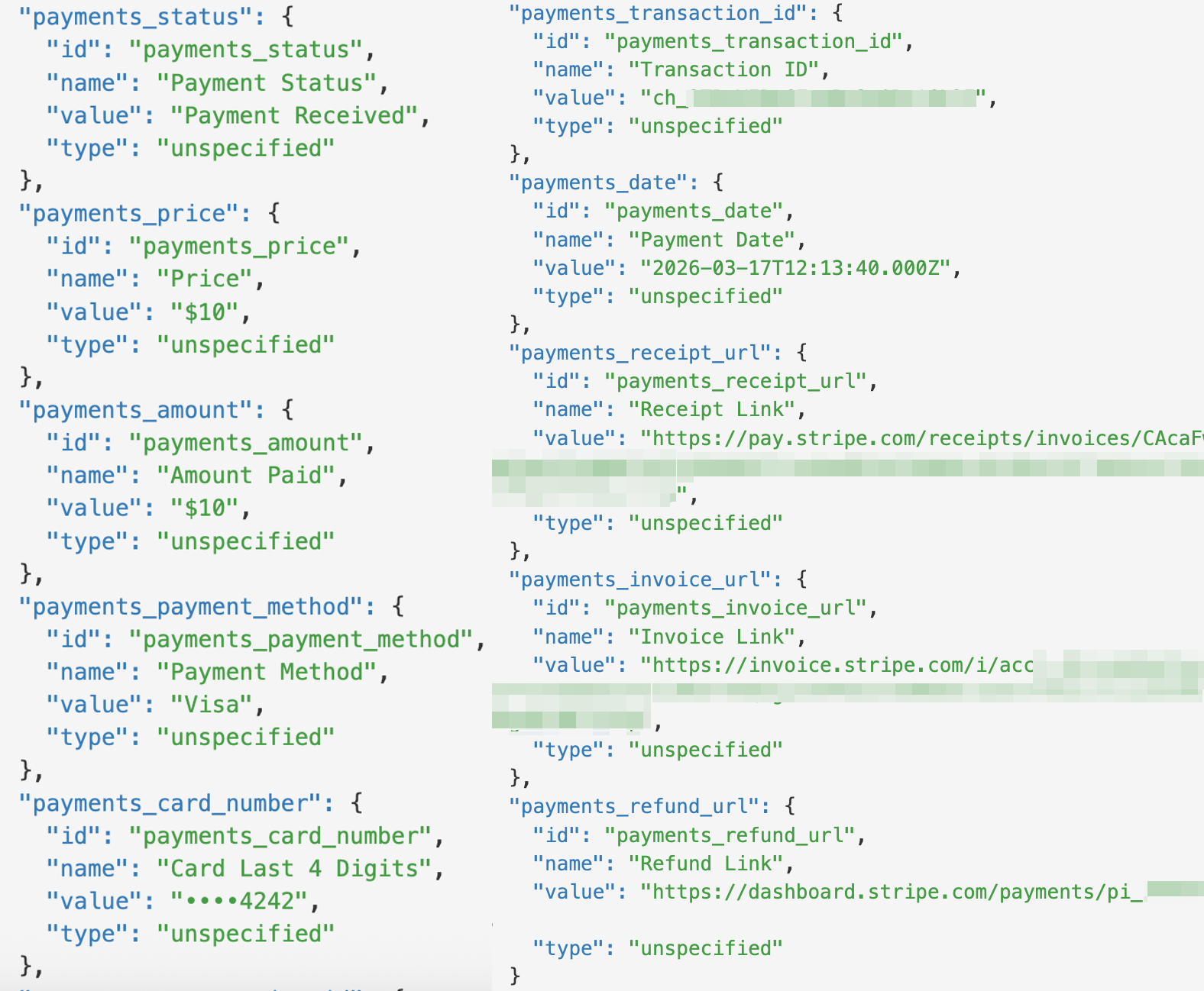 Once payments are enabled, you can access the payment data in your Stripe Dashboard and your submission notifications. The following payment details will be transferred: