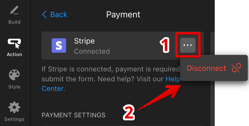 In the widget editor, open the Action tab and make sure Lead Form is selected. Then scroll down and click Payment: